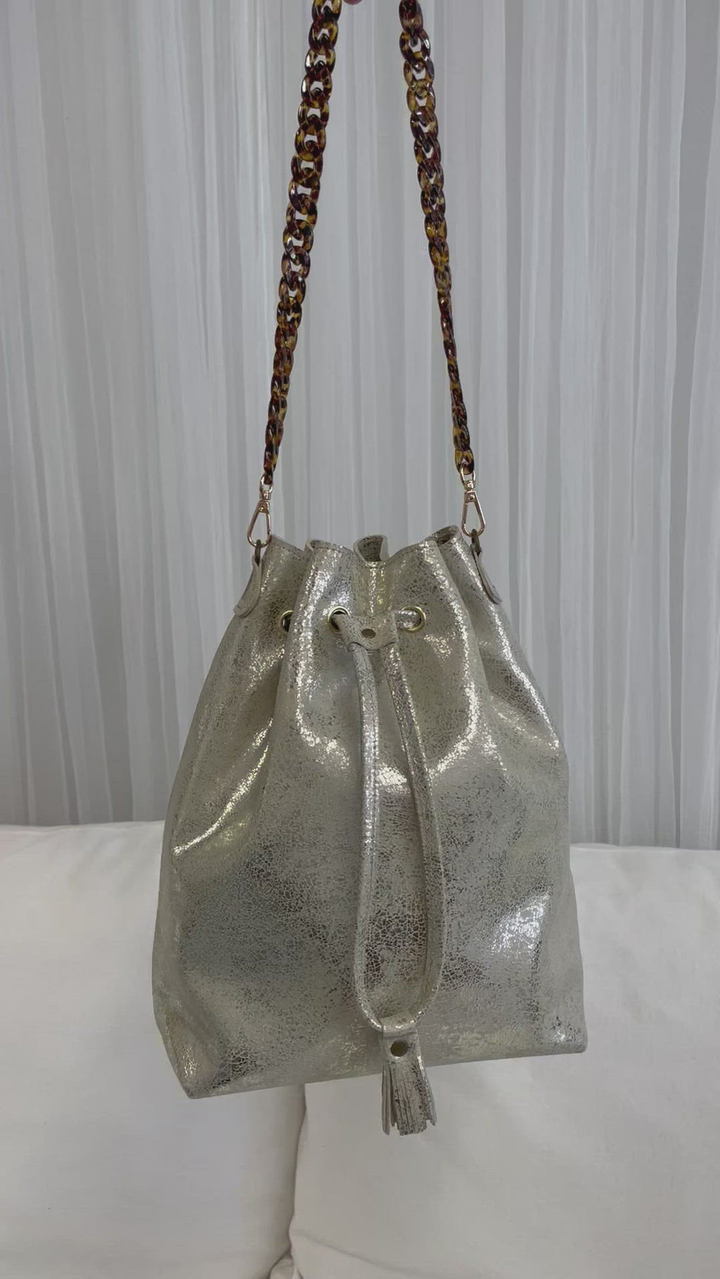 • Drawstring leather closure with mini leather tassel