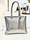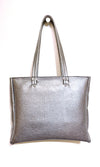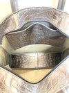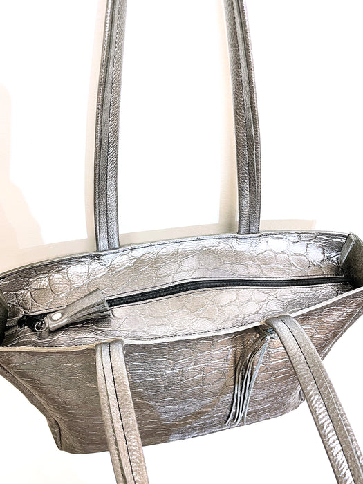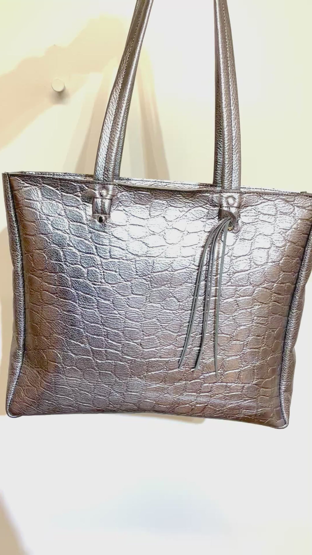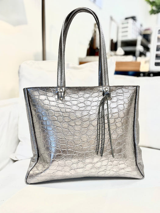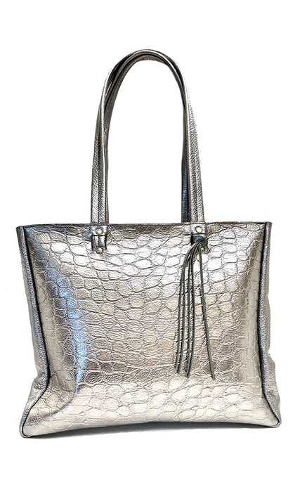 • Genuine leather with a rich metallic pewter embossed alligator finish