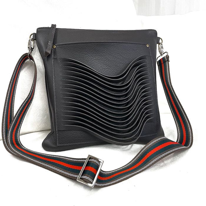 • Outer pocket with hand cut leather detail